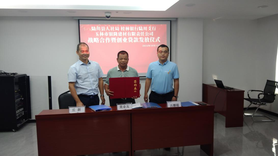 近日,玉林市银隆建材有限责任公司创业担保贷款业务合作签约仪式在桂林银行陆川支行会议室举行,此次签约共发放担保贷款400万元。陆川县人力资源和社会保障局、桂林银行陆川支行、玉林市银隆建材有限责任公司等相关人员出席签约仪式。