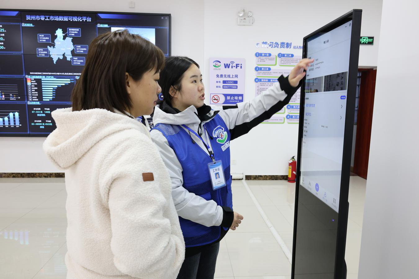贺州市零工市场工作人员正在为求职者提供岗位搜索服务
