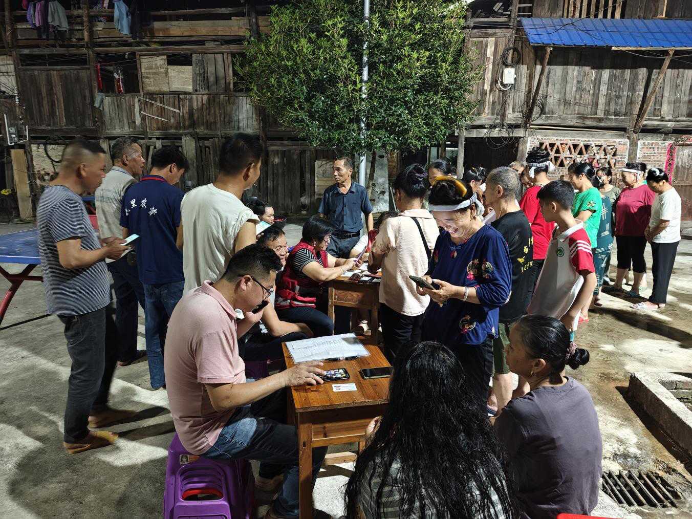 近日,夜幕降临,柳州市三江侗族自治县同乐乡同乐村鼓楼前的球场上、村部办公楼里灯火通明。三江侗族自治县人力资源和社会保障局驻村工作队员与村两委干部抓住晚间村民集中在家的黄金时段,一场围绕茶产业溯源平台及村级服务平台的注册推广行动正在这里有序开展。