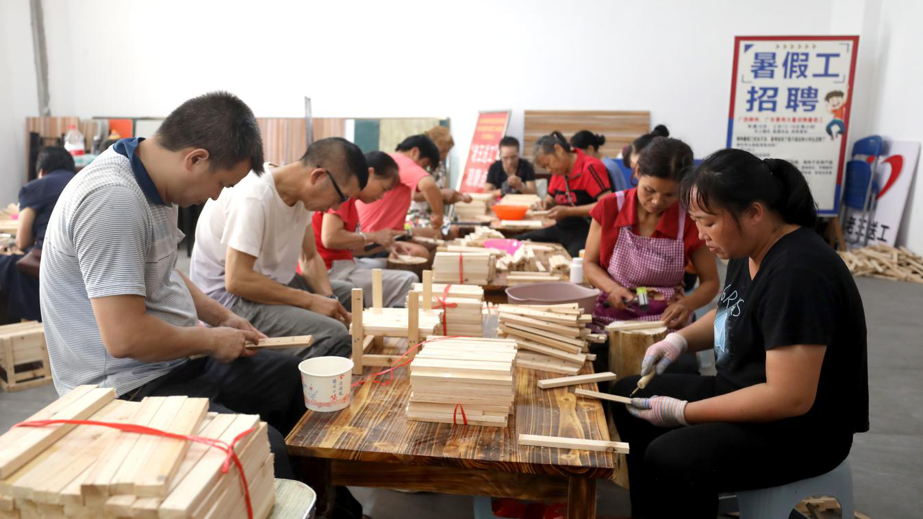 在融安县零工驿站,搬迁小区群众在制作蜂巢木架子。