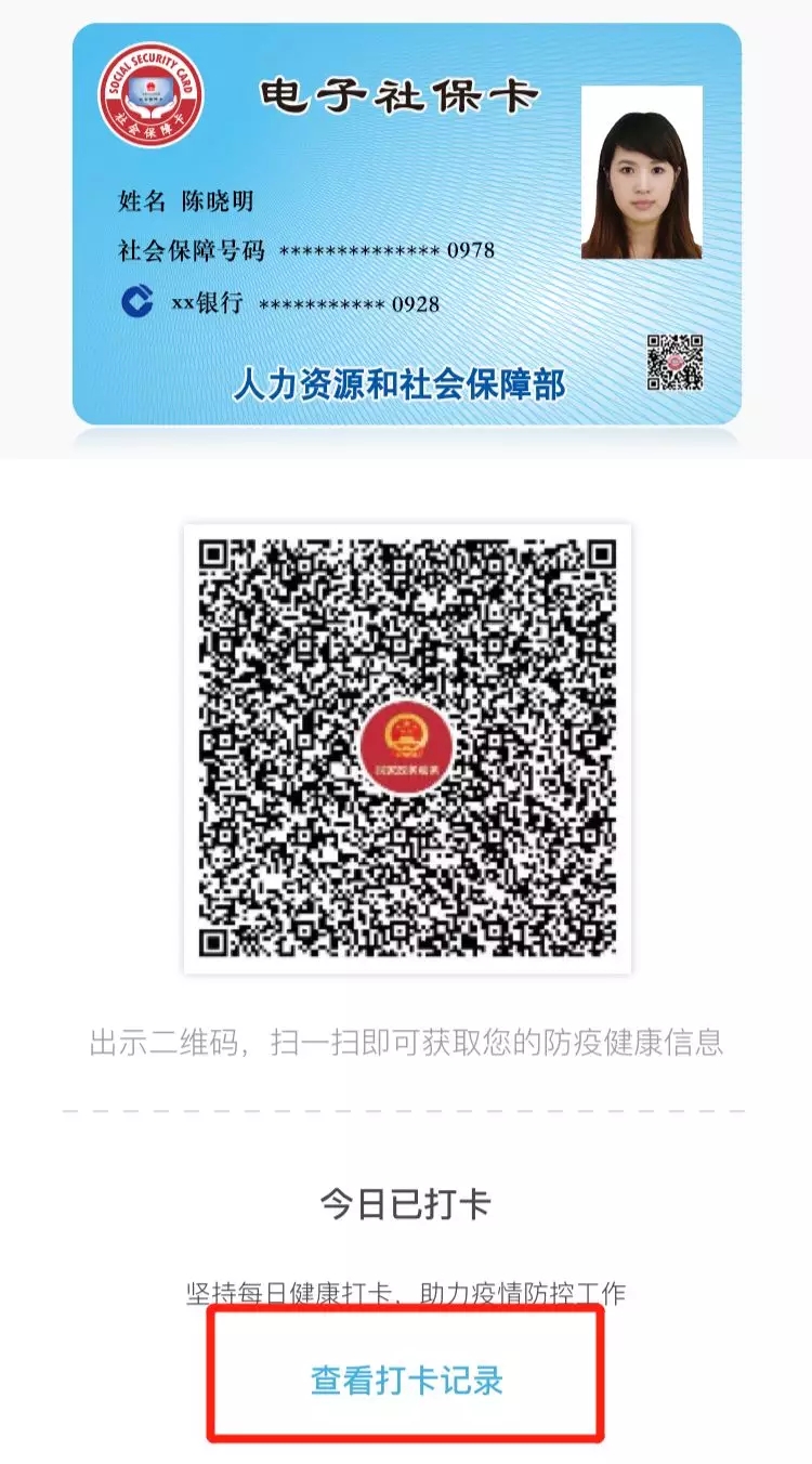 电子社保卡对接国家政务服务平台防疫信息码,依托全国一体化在线政务服务平台,利用平台汇聚的卫生健康、民航、铁路等方面数据,结合电子社保卡自身实名实人信息,为公众提供本人防疫健康信息相关查验服务。