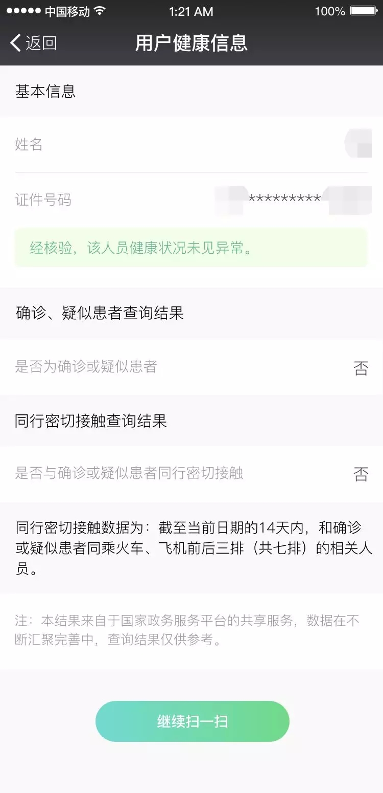如需连续扫描多人,工作人员可在扫描结果页面里点击“继续扫一扫”检查其他返岗复工人员的健康状况。