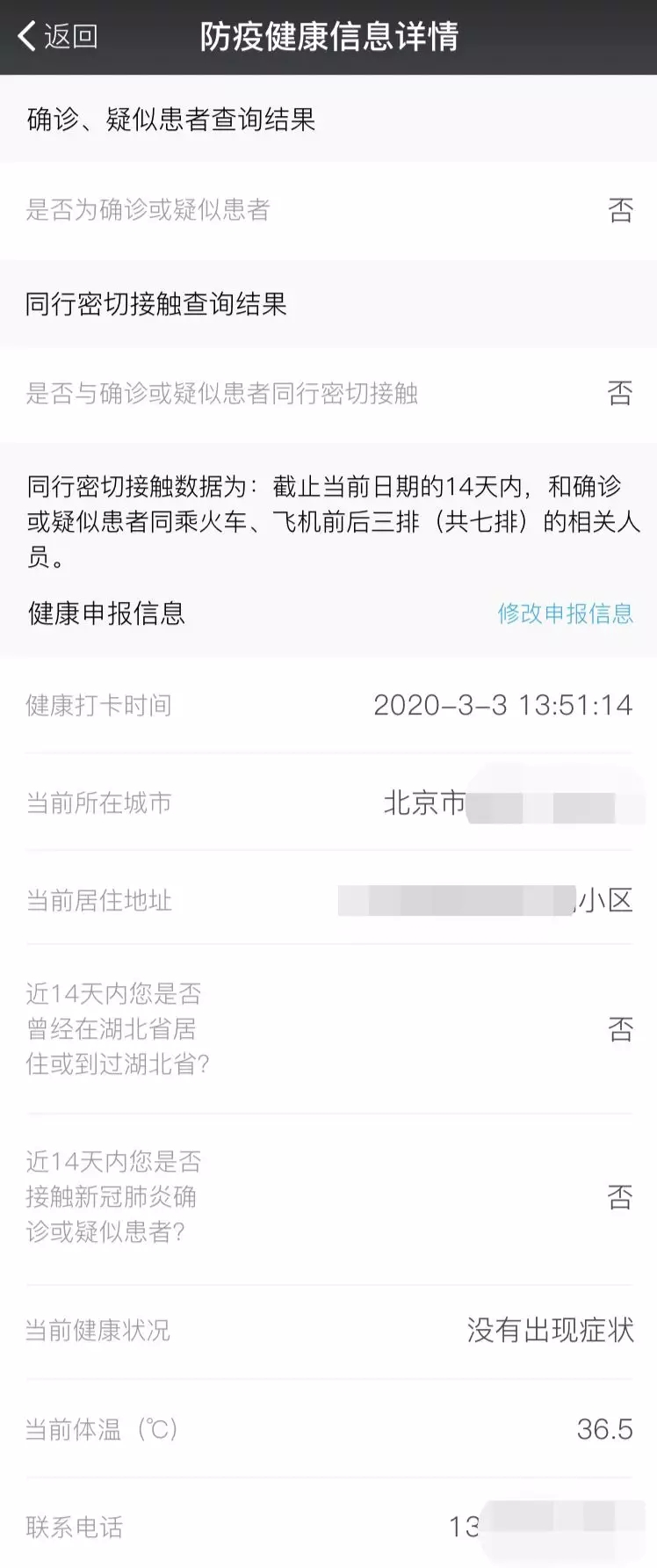 在防疫健康信息码首页,个人点击“查看本人防疫健康信息详情”,可实时查询本人的防疫健康状况(是否为确诊、疑似患者或密切接触者),以及个人最后一次防疫健康打卡的信息。