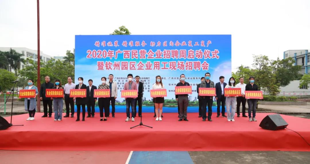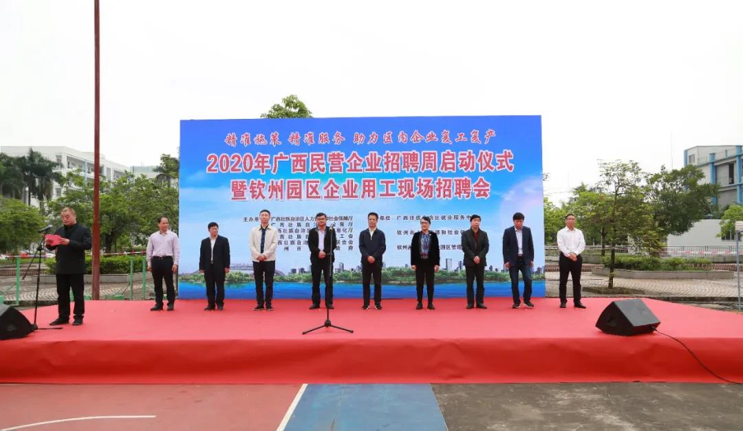 2020年4月10日上午,自治区人力资源社会保障厅、教育厅、工业和信息化厅、总工会、工商联、钦州市人民政府在钦州市高新技术产业园区举行“2020年广西民营企业招聘周”活动启动仪式。
