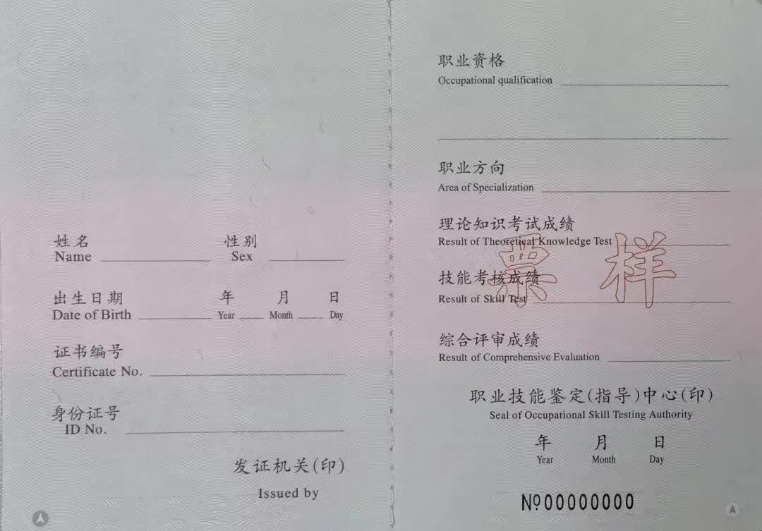 技能人员职业资格证书(不含特种作业操作证等),从左到右依次为五级/初级工职业资格证书、四级/中级工职业资格证书、三级/高级工职业资格证书、二级/技师职业资格证书和一级/高级技师职业资格证书,封面颜色不同。