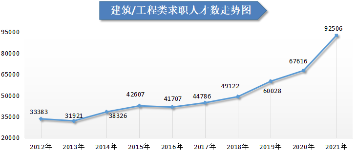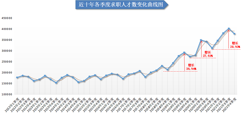 从人才供应量走势看,近年来广西人才网中人才供应量呈增长态势,近三年增长明显。2021年求职人才数为722220人,与上年度相比增加116135人,增幅为19.16%,其中2021年第三季度的求职人才数再创新高,达到近十年季度求职人才数的最高值,401422人,与2020年第四季度相比大幅增长28.93%。