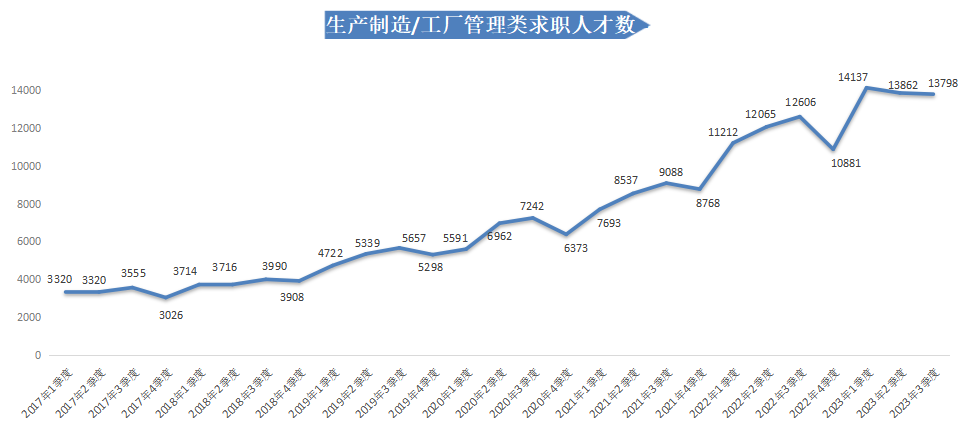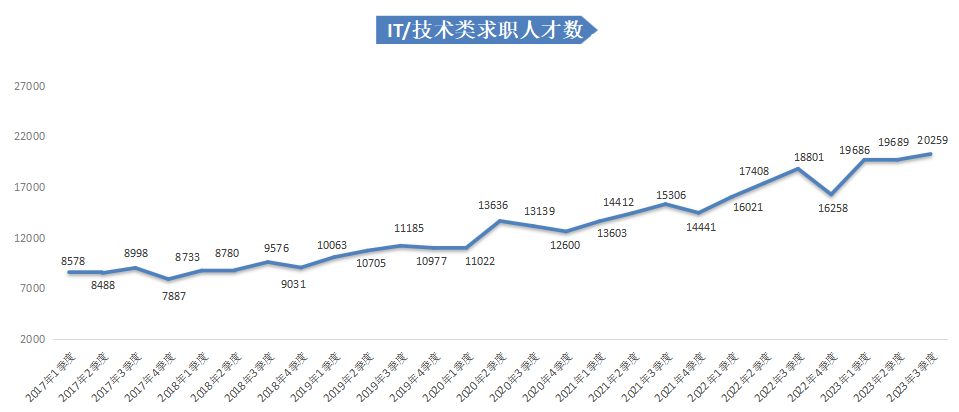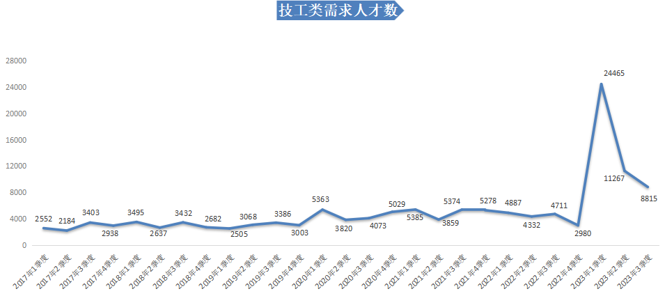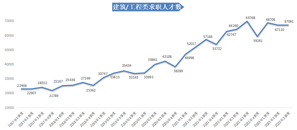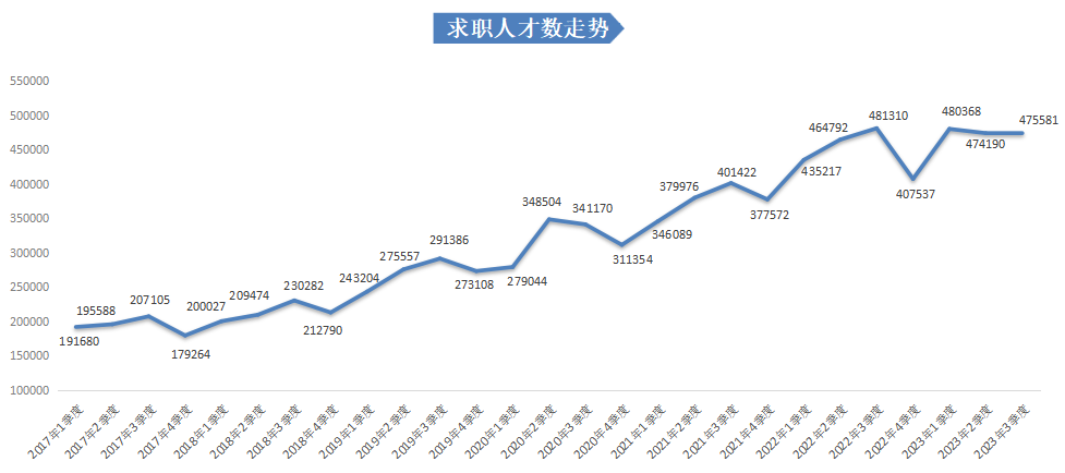 2023年第三季度,求职人才数依旧维持高位,达475581人,同比小幅下滑1.19%。