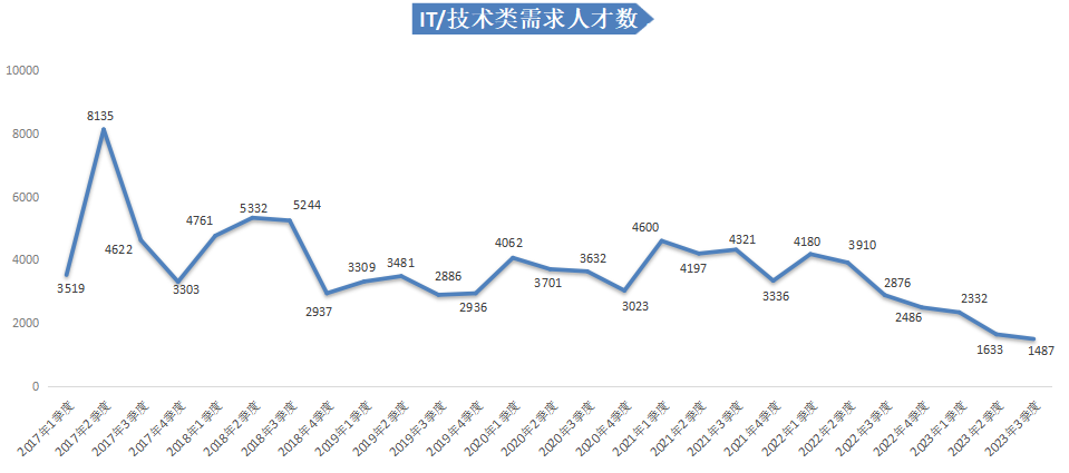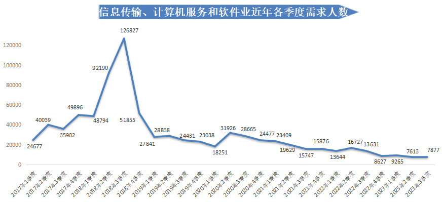 在人才需求方面,2023年第三季度人才需求量持续下滑,有招聘需求的用人单位需求人才数为81542人,同比下滑4.49%,环比下滑17.07%。