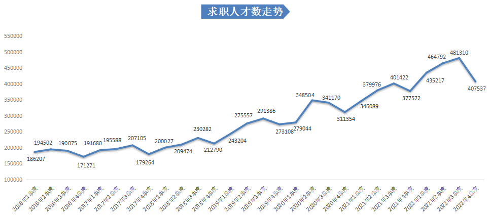 2022年第四季度,广西人才网中求职人才数为407537人,与上季度相比下滑15.33%,但与上年同期相比仍增长7.94%。