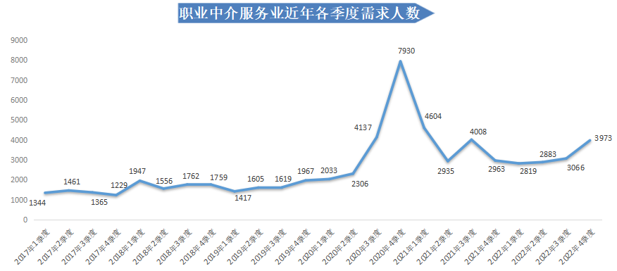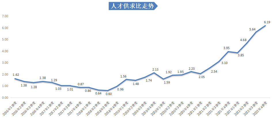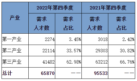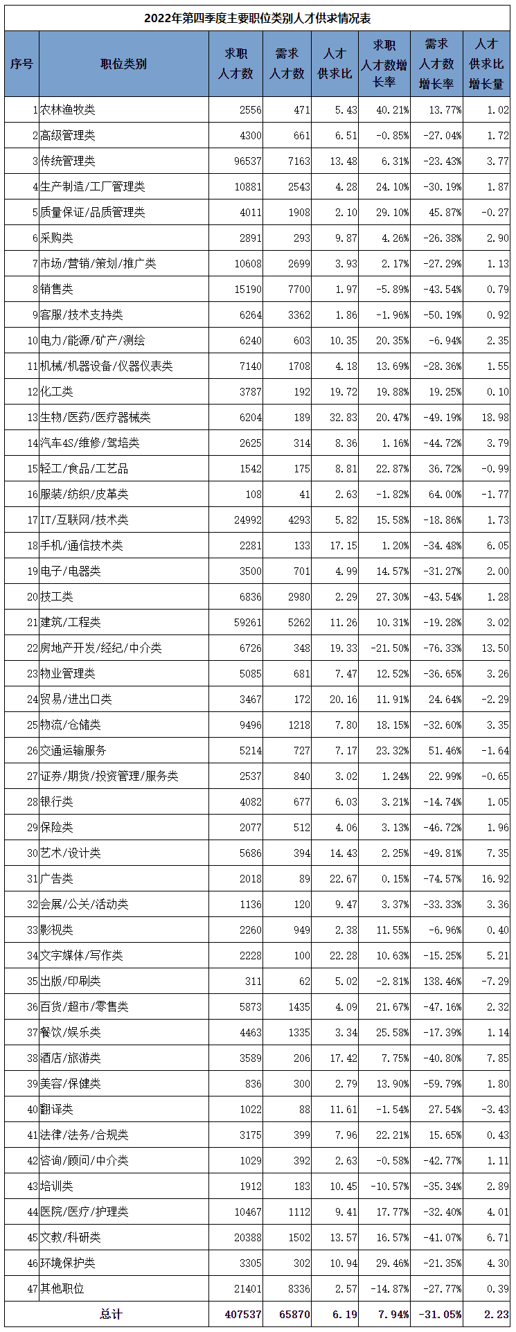 2022年第四季度,客观环境较为复杂,疫情防控全面放开后招聘市场几乎处于停滞状态,需求人才数和求职人才数环比均出现不同程度的下滑。