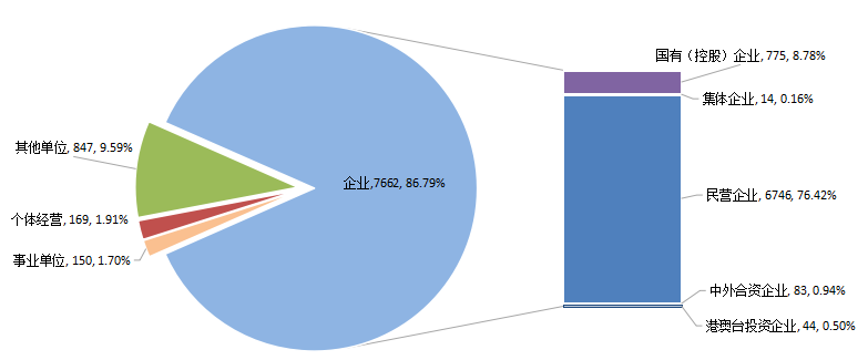 2022年第四季度,广西人才网中用人单位数量为8828家,比上年同期下滑20.65%,用人单位中企业共有7662家,与上年同期相比下滑21.44%,占比86.79%,其中民营企业为6746家,比上年同期下滑23.58%。