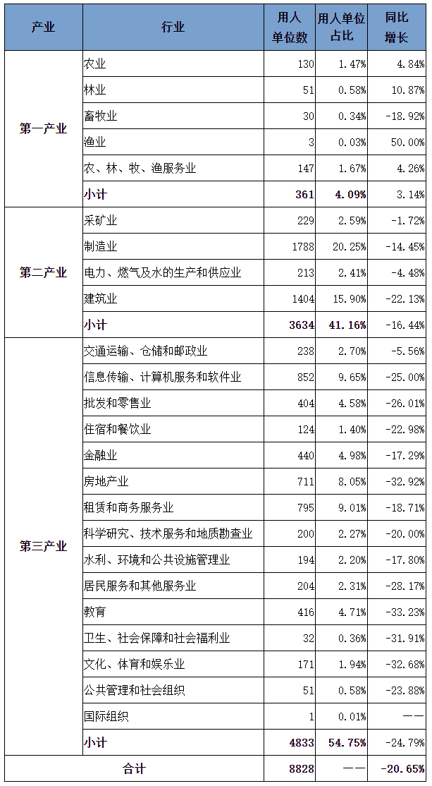 在总体人才需求大幅下滑的局势下,信息传输、计算机服务和软件业下的电子技术/半导体/集成线路行业的人才需求同比仍有增长,需求人才数为1827人,比上年同期增加328人,同比增长21.88%;租赁和商务服务业下的职业中介服务行业的人才需求则有较明显的回升趋势,其需求人才数为3973人,同比增加1010人,同比增长34.09%,环比增长29.58%。