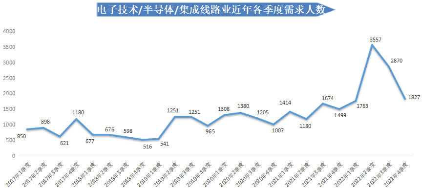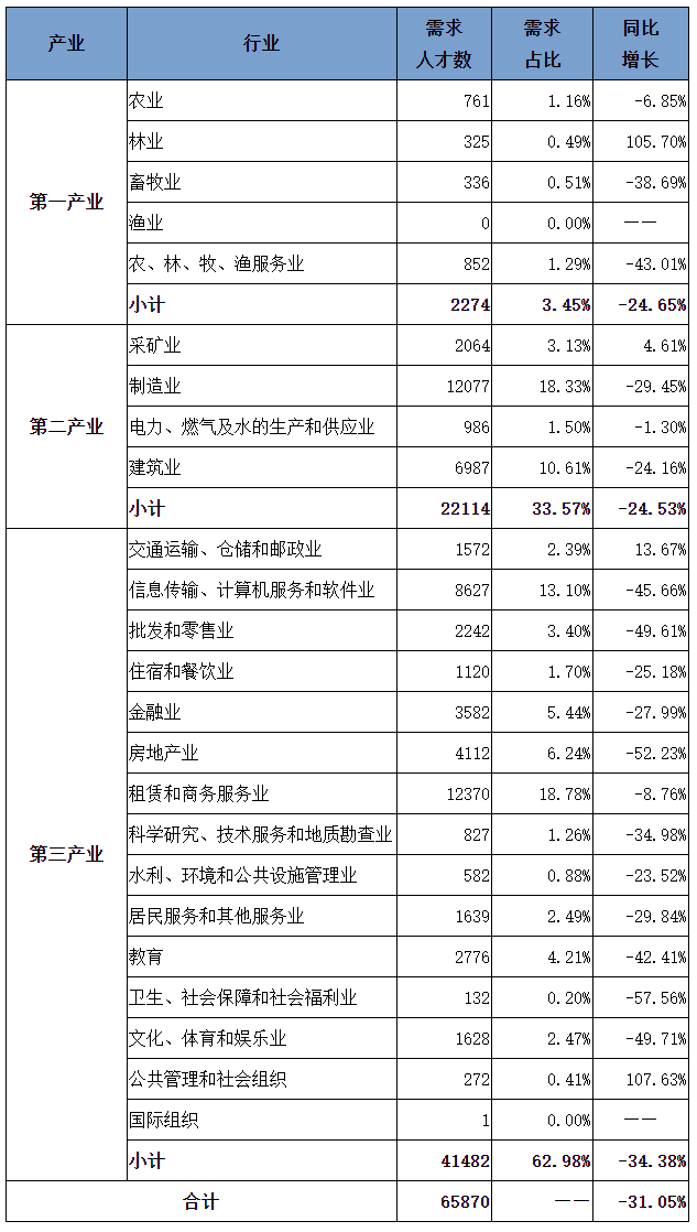 从细分行业看,信息传输、计算机服务和软件业下的计算机硬件及网络设备、计算机软件、互联网、通讯/通信运营及其他服务等行业的人才需求量出现大幅下滑,与上年同期相比合计减少6401人,降幅为58.96%;而电子技术/半导体/集成线路行业虽与上季度相比有所下滑,但同比仍有增长,需求人才数为1827人,比上年同期增加328人,同比增长21.88%。