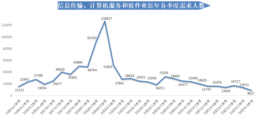 2022年第四季度,广西人才网中信息传输、计算机服务和软件业人才需求持续低迷,需求人才数为8627人,比上年同期的15876人减少7249人,同比下滑45.66%,环比下滑36.71%。