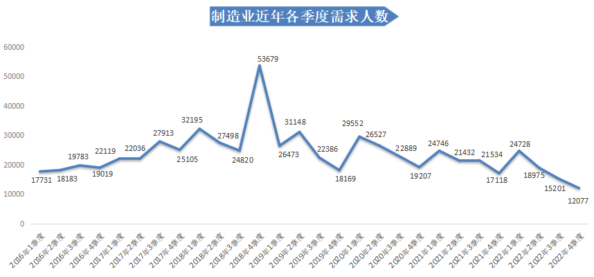 2022年第四季度,制造业需求人才数为12077人,比上年同期的17118人减少5041人,同比下滑29.45%。其中,快速消费品、汽车/摩托车(制造/维护/配件/销售/服务)、医药/医疗器械/医疗机构等行业的人才需求量同比减少较多,需求人才数分别为1629人、1772人和2807人,与上年同期相比减少1744人、1254人和1222人,降幅分别为51.70%、41.44%和30.33%。