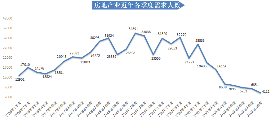 2022年第四季度,房地产业人才需求量持续下滑,需求人才数为4112人,与上年同期的8608人相比减少4496人,同比下滑52.23%。房地产业人才需求的大幅下跌主要受房地产开发经营、房地产中介服务等行业的影响,这两个行业的需求人才数分别为1707人和349人,与上年同期相比减少了1893人和1160人,降幅分别为52.58%和76.87%。