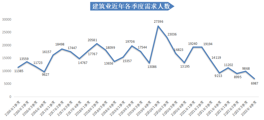 2022年第四季度,广西人才网中建筑业的人才需求量呈下降趋势,其需求人才数为6987人,与上年同期的9213人相比减少了2226人,同比下滑24.16%。其中,建筑装饰(装修、装潢、清理等)、房屋和土木工程建筑、建筑安装等行业人才需求与上年同期相比分别减少806人、385人和232人,降幅分别为49.45%、9.37%和25.61%。