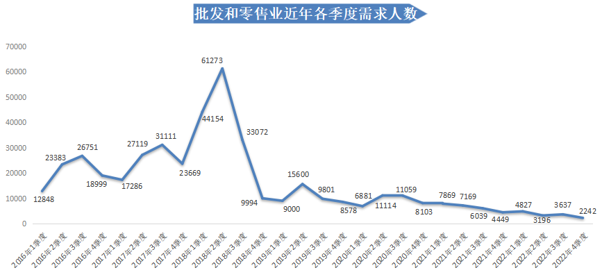 2022年第四季度,广西人才网中批发和零售业人才需求量较低迷,需求人才数为2242人,比上年同期的4449人减少2207人,同比下滑49.61%。