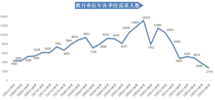 近两年,广西人才网中教育业人才需求下降趋势明显,截至2022年第四季度,需求人才数下降至2776人,与上年同期的4820人相比减少2044人,同比下滑42.41%,环比下滑27.82%。