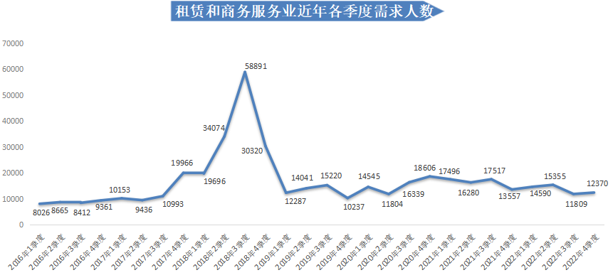 2022年第四季度,广西人才网中租赁和商务服务业的人才需求量位居榜首,其需求人才数为12370人,与上年同期的13557人相比减少1187人,同比下滑8.76%。