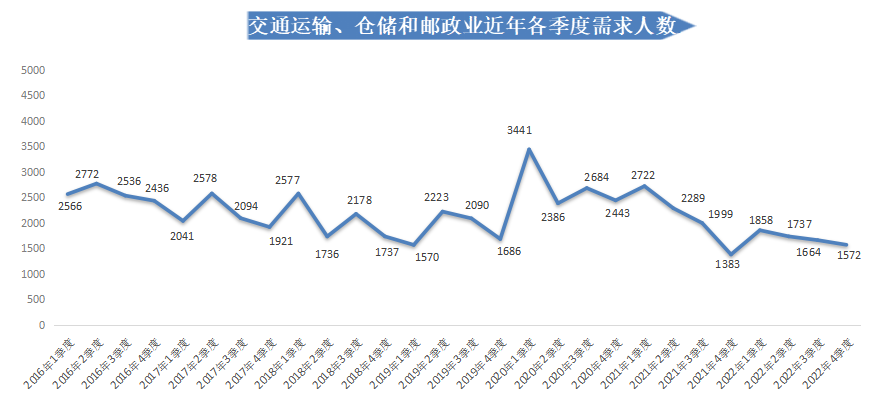 另外,本季度仍有5个行业类型的人才需求实现增长。其中,需求人才数增长量排名第一的是交通运输、仓储和邮政业,其需求人才数为1572人,比上年同期增加189人,同比增长13.67%。