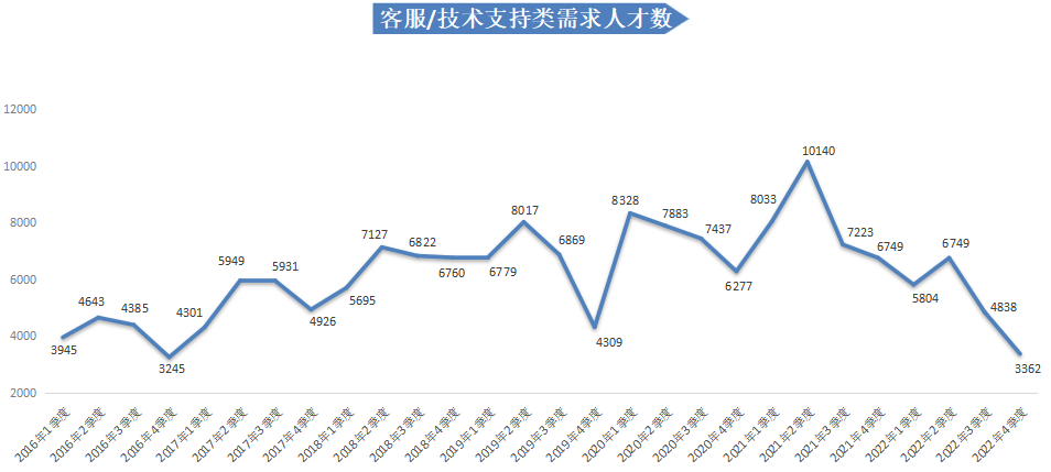 2022年第四季度,广西人才网中客服/技术支持类职位的需求人才数为3362人,比上年同期的6749人减少3387人,同比下滑50.19%。其中,客服专员/助理(非技术)职位人才需求的减少是导致客服/技术支持类职位人才需求同比大幅下滑的主要原因,其需求人才数为1895人,比上年同期减少2902人,降幅为60.50%。