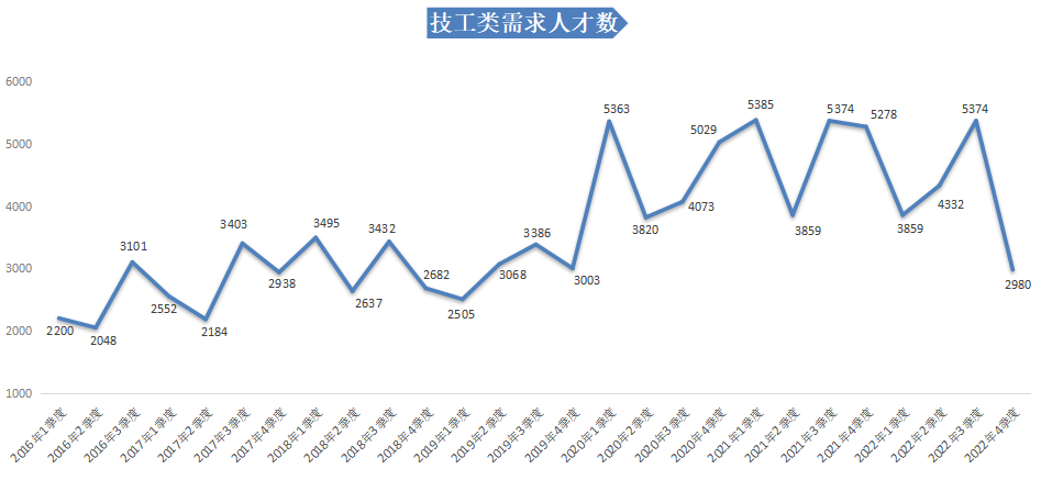 另外,本季度有11个职位类别实现增长,其中增长较大的职位类别是质量保证/品质管理类,需求人才数为1908人,比上年同期增加600人,同比增长45.87%。