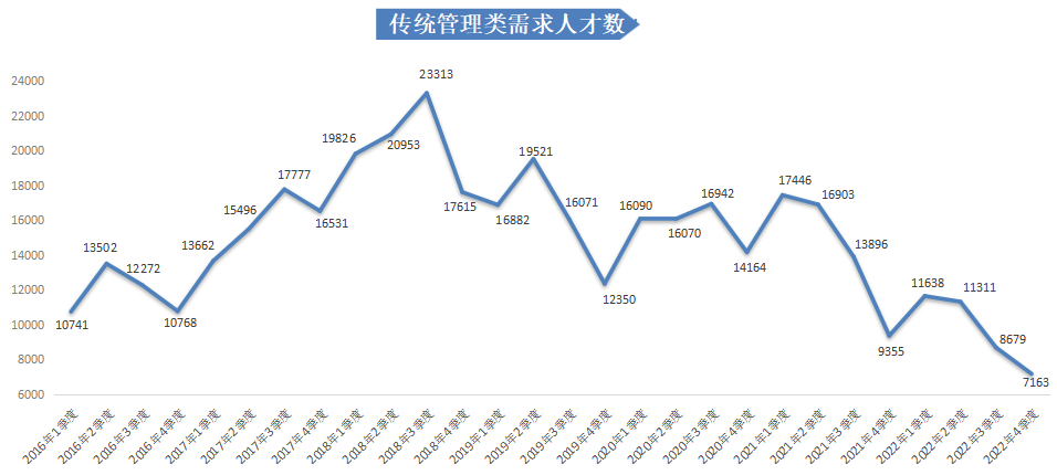 2022年第四季度,广西人才网中传统管理类职位(包含行政/文职/后勤类、人力资源/人事类、财务/税务/审计/统计类职位,下同)人才需求量为7163人,比上年同期的9355人减少2192人,同比下滑23.43%。其中,行政/文职/后勤类、财务/税务/审计/统计类、人力资源/人事类职位需求人才数分别为3000人、2397人、1766人,与上年同期相比分别减少了1162人、976人和54人,同比降幅分别为27.92%、28.94%和2.97%。