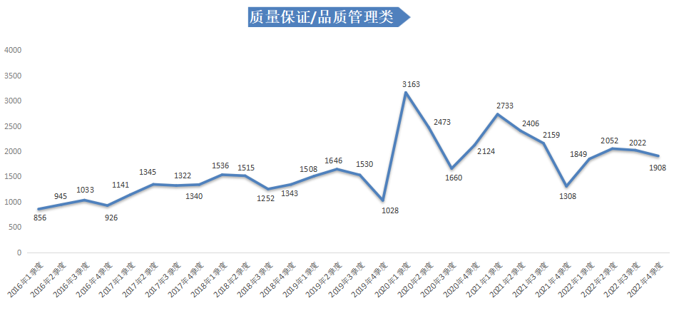 2022年第四季度,广西人才网中质量保证/品质管理类职位的需求人才数为1908人,比上年同期的1308人增加600人,同比增长45.87%。其中,质检员/测试员、化验员/检测员等职位是质量保证/品质管理类职位人才需求的主要增长点,需求人才数分别为650人、733人,比上年同期增加334人和249人,涨幅分别为105.70%和51.45%。