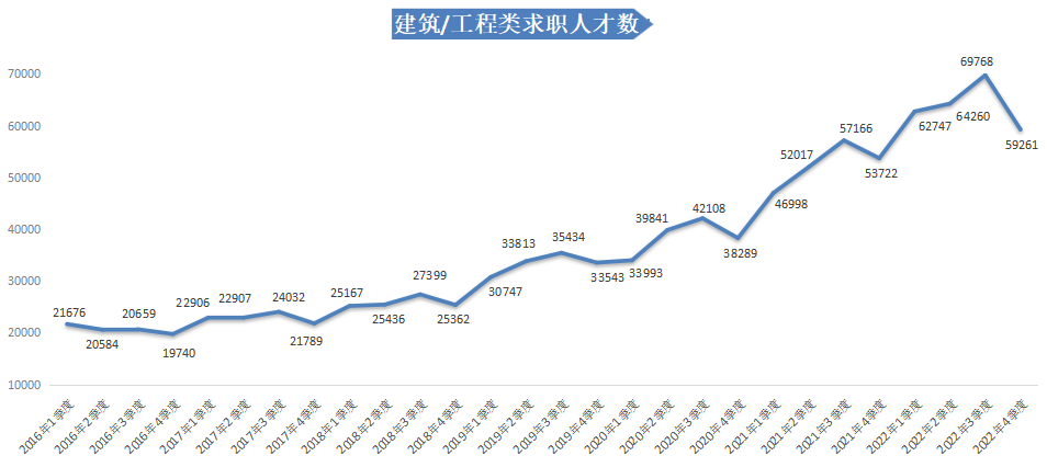 2022年第四季度,广西人才网中建筑/工程类职位的求职人才数与上季度相比有所下降,但仍处于较高水平,为59261人,与上年同期的53722人相比增加5539人,同比增长10.31%,是本季度人才供应量最多且同比增长量最大的职位类型。
