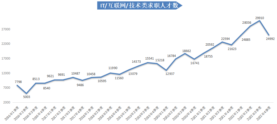 2022年第四季度,广西人才网中IT/互联网/技术类(包含计算机硬件开发类、计算机软件开发类、IT管理/项目协调类等七类职位类别,具体见附表3,下同)职位的人才供应量虽呈季节性下滑,但同比仍有增长,其求职人才数为24992人,与上年同期的21623人相比增加3369人,同比增长15.58%。其中,计算机软件开发类、互联网产品/运营管理/电子商务类、计算机硬件开发类等职位的求职人才数增长较多,分别比上年同期增加865人、759人和600人,涨幅分别为20.90%、12.48%和28.40%。