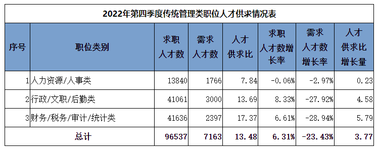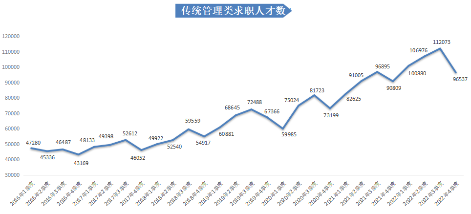 2022年第四季度,广西人才网中传统管理类职位(包含行政/文职/后勤类、人力资源/人事类、财务/税务/审计/统计类职位,下同)的求职人才数达96537人,与上年同期的90809人相比增加5728人,同比增长6.31%。其中,行政/文职/后勤类、财务/税务/审计/统计类职位的求职人才数分别为41061人和41636人,与上年同期相比分别增加了3157人和2580人,涨幅分别为8.33%和6.61%;人力资源/人事类职位的求职人才数为13840人,与上年同期相比基本持平,微降0.06%。