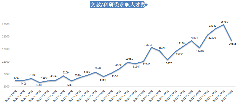 2022年第四季度,广西人才网中文教/科研类职位的人才供应量虽季节性下滑,但与上年同期相比仍有增长,其求职人才数为20388人,与上年同期的17490人相比增加2898人,同比增长16.57%。