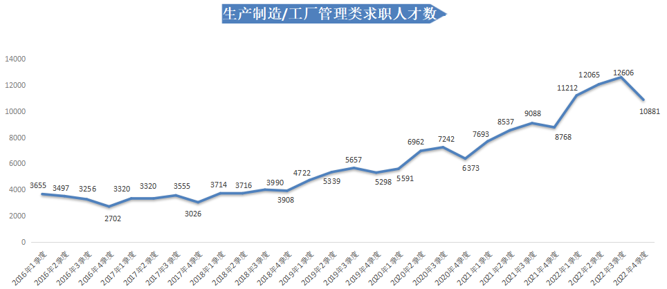 2022年第四季度,广西人才网中生产制造/工厂管理类职位的求职人才数为10881人,与上年同期的8768人相比增加2113人,同比增长24.10%。