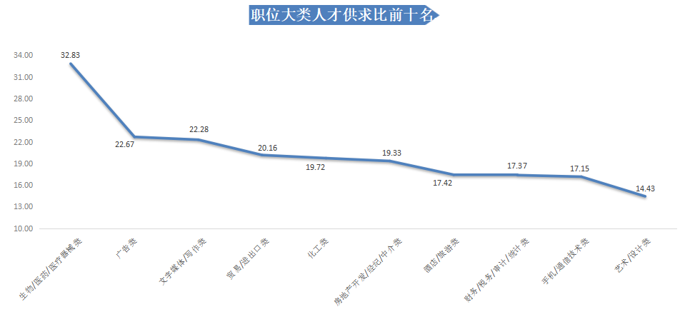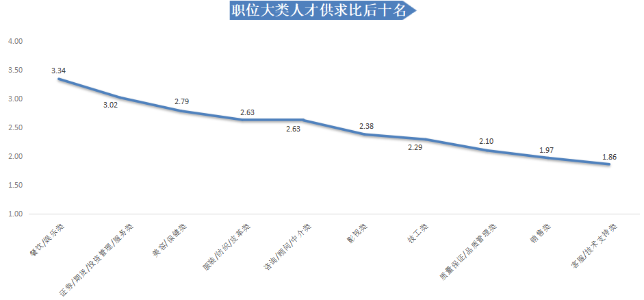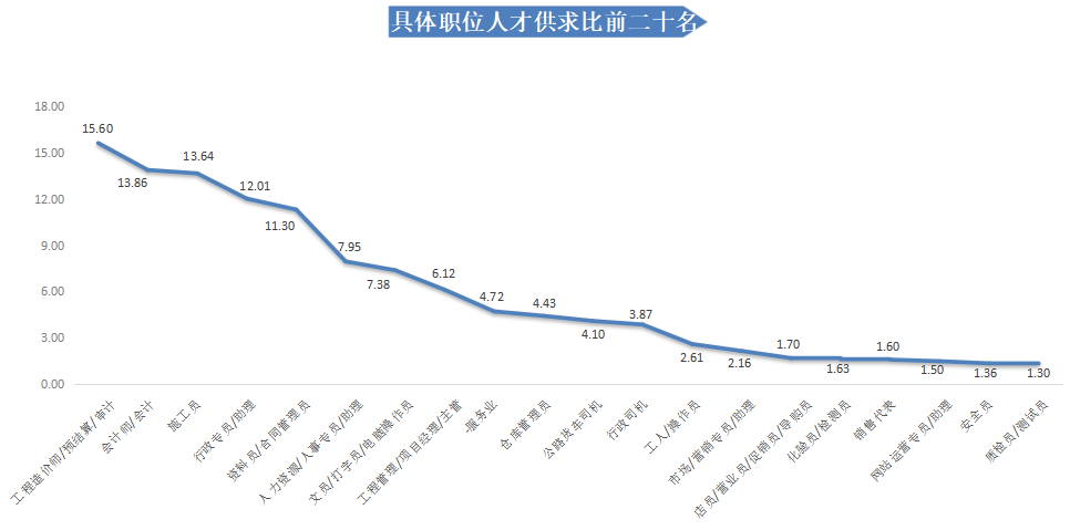 从具体职位看,在人才需求量具有一定规模的职位人才竞争激烈程度的前二十名具体职位中,最高供求比高达15.60,超过15人竞争1个岗位,第二十名的职位也超过1个人竞争1个岗位。
