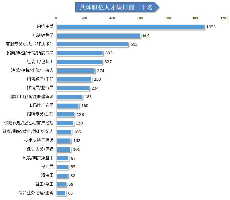 而在具体职位中,部分职位仍存在一定的人才缺口,从用人单位最急需人才的前二十名具体职位排名可看到,业务类人才较为紧缺,有六成的职位与业务挂钩,其中网络主播、电话销售员、客服专员/助理(非技术)等职位人才缺口排名前三,这三个职位的人才缺口分别达到1055人、601人及513人。