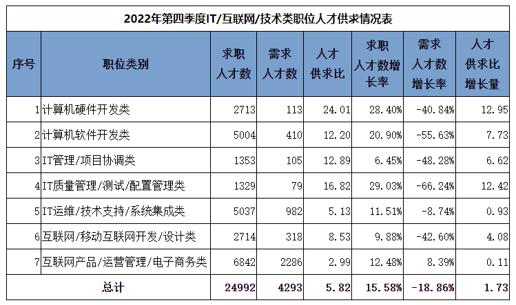 2022年第四季度,广西人才网中IT/互联网/技术类(包含计算机硬件开发类、计算机软件开发类、IT管理/项目协调类等七类职位类别,具体见附表3,下同)职位的需求人才数为4293人,与上年同期的5291人相比减少998人,同比下滑18.86%。其中,计算机软件开发类等职位的人才需求同比减少量超过500人,其需求人才数为410人,比上年同期减少514人,降幅为55.63%。