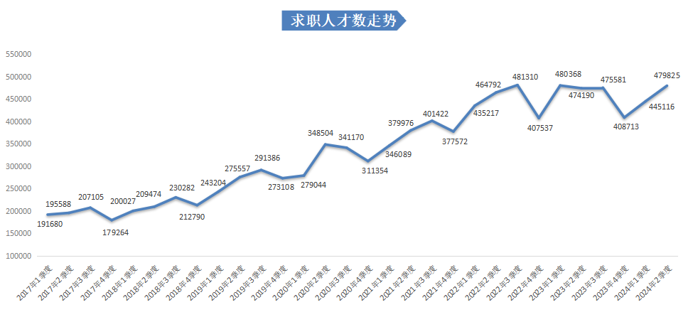 广西人才网中的求职人才数呈现持续增长态势,2024年第二季度达到479825人,同比增长1.19%,环比增长7.80%。