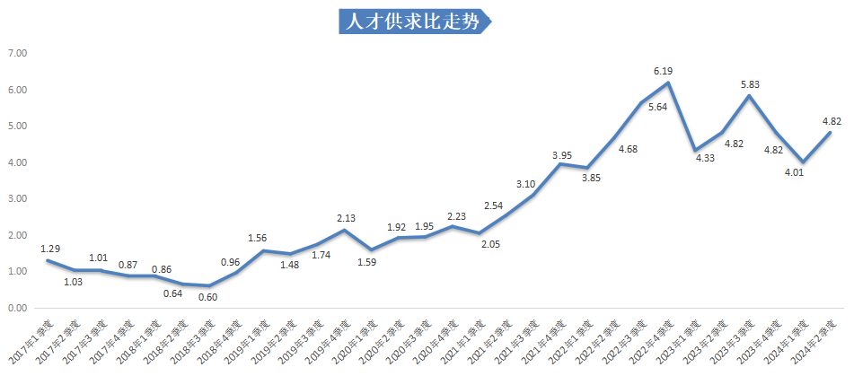 2024年第二季度,广西人才网中人才供求比4.82,即超过4个人竞争1个岗位。这一比例与去年同期持平,但相较于上季度有所增长,增加了0.81,人才供求比维持在较高水平。