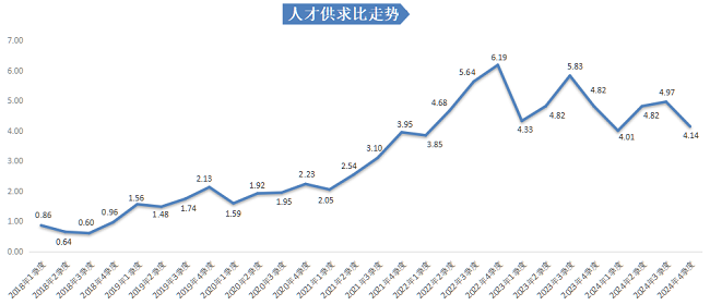 2024年第四季度,广西人才网中人才供求比为4.14,即超过4个人竞争1个岗位。这一比例在本季度有所下降,与去年同期相比减少0.68,与上季度相比减少0.83。
