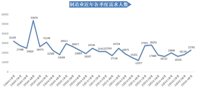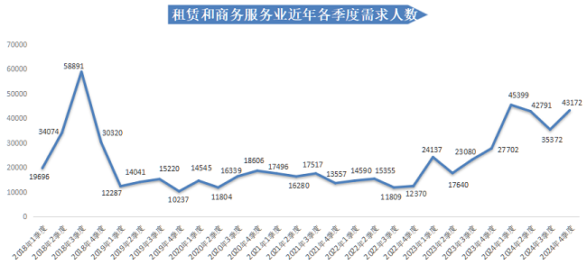在24个主要行业类别中,有6个行业类别的人才需求相较于上年同期实现不同程度的增长。其中,增长主要集中在租赁与商务服务业、制造业中,租赁与商务服务业的需求人才数比上年同期增加15470人,同比增长55.84%,是本季度人才需求量同比增长最多的行业类别;制造业的需求人才数比上年同期增加6569人,同比增长40.52%。