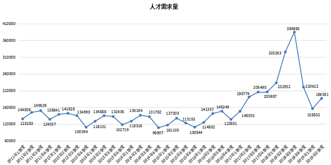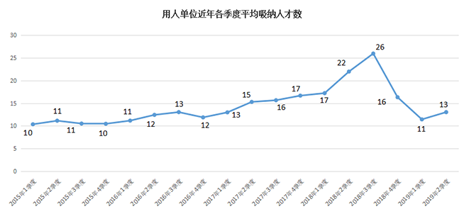 近年各季度用人单位平均吸纳人才数量走势图: