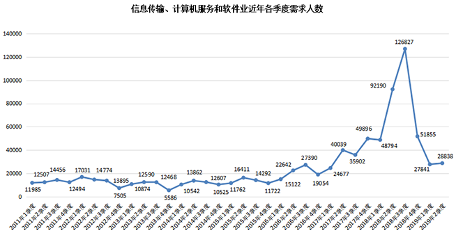 1.信息传输、计算机服务和软件业需求人才数为28838人,与上年同期的92190人相比减少了63352人,同比降幅高达68.72%。其中,电子商务和互联网行业需求人才数分别仅为6876人和7347人,比上年同期的47450人和33150人分别减少40574人和25803人,同比降幅分别达到85.51%77.84%。