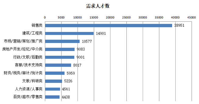 位居需求榜前十名的职位:销售类、建筑/工程类、市场/营销/策划/推广类、房地产开发/经纪/中介类、行政/文职/后勤类、客服/技术支持类、财务/税务/审计/统计类、文教/科研类、人力资源/人事类、百货/超市/零售类等职位类型。这十个职位类型的需求人才数总计110714人,占人才总需求量的59.40%。