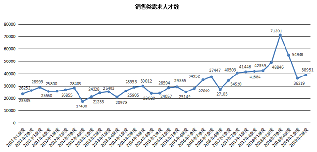 2019年第二季度,销售类职位需求人才数为38951人,虽然随季节变化有所回升,环比增长7.54%,但仍比上年同期的48846人减少9895人,降幅为20.26%。导致销售类职位人才需求同比下滑的主要原因是销售代表、销售助理以及推销员/业务员等基层职位需求人才数的大幅减少,其同比分别减少4583人、2367人以及2316人,降幅分别达到34.00%、65.91%以及35.63%。