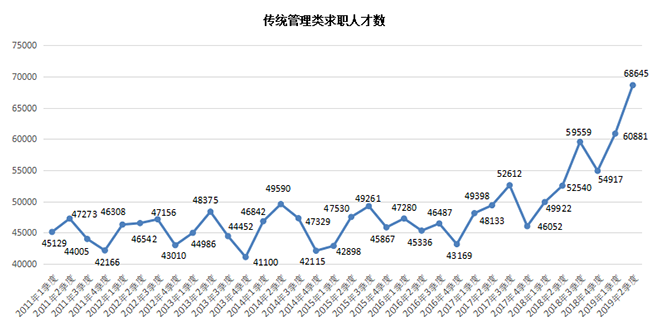 2.三大传统管理类职位(包含行政/文职/后勤类、人力资源/人事类及财务/税务/审计/统计类等职位类别,下同)的人才供应总量创新高,其求职人才数合计达到68645人,与上年同期相比增加16105人,同比大幅增长30.65%。