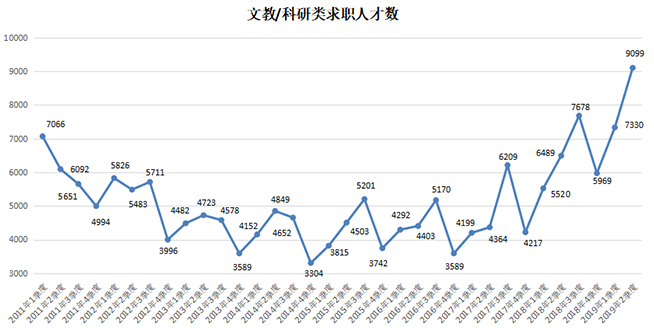 3.文教/科研类职位的求职人才数创历史新高,为9099人,比上年同期增加2610人,同比涨幅达到40.22%。