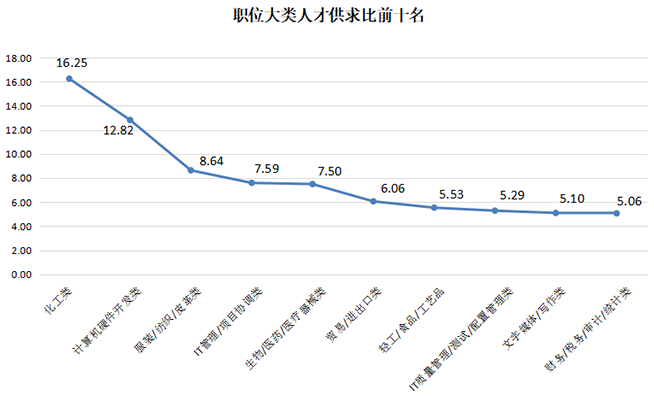 54个主要职位类型中,人才供求比大于2的职位类型高达37个,其中22个类型的职位竞争激烈,人才供求比大于3。其中化工类、计算机硬件开发类及服装/纺织/皮革类职位需求极少,就业竞争压力大,其供求比分别高达16.25、12.828.64。