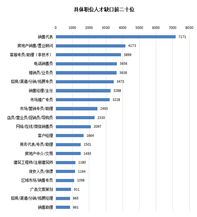 而在用人单位最急需人才的前二十名具体职位中,销售类、市场/营销/策划/推广类等业务类人才需求最为紧缺,有超八成职位与其挂钩,将近四成的销售类职位进入人才缺口前二十排行榜。其中销售代表、房地产销售/置业顾问及客服专员/助理(非技术)等职位分列前三名,这三个职位人才缺口分别为7171人、4173人及3899人。