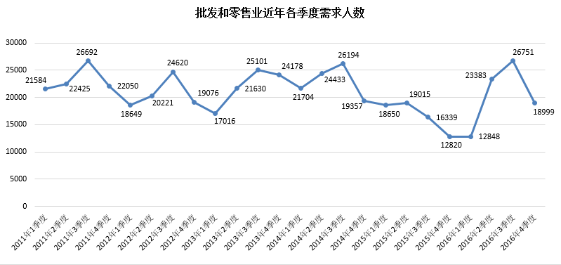 3.虽然传统批发业和超市、商场、商店等零售业均受到电子商务不同程度的冲击,但批发和零售行业人才需求量依靠贸易/进出口行业拉动,本季度人才需求达到18999人,与上年同期的12820人相比增加6179人,大幅增长48.20%。
